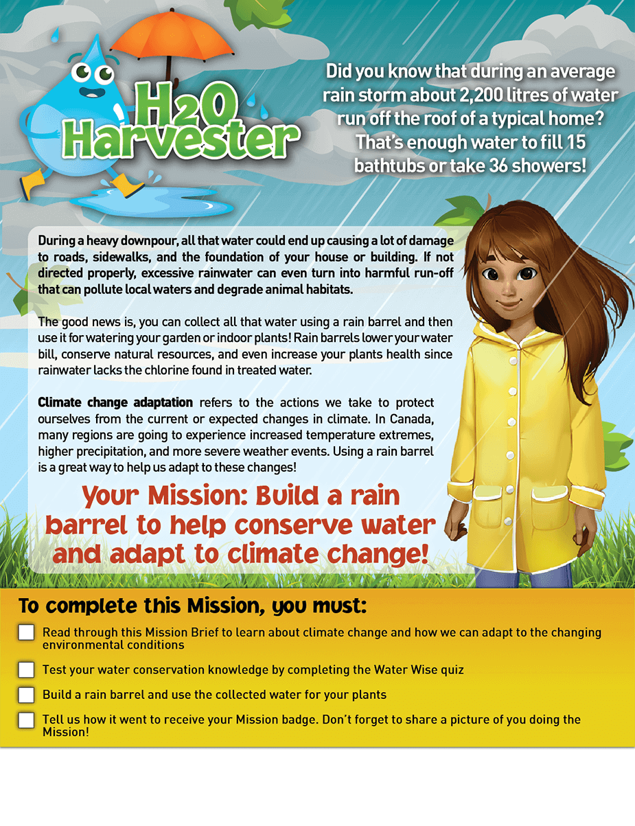 The effects of climate change will vary depending on where you live in Canada but overall, we can expect to see more heavy downpours in the future. The great news is, you can collect all that water and then use it for watering your garden or indoor plants. Become an H2O Harvester by building a rain barrel to help conserve water and adapt to climate change!