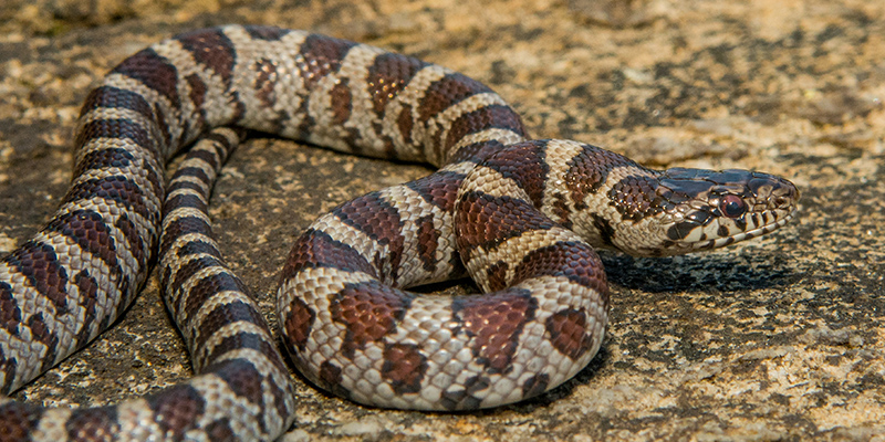 This is the marvelous eastern milksnake. It can look a bit like the venomous Massasauga rattlesnake, but there are a few important differences. Interested in learning more? Check out this quiz.